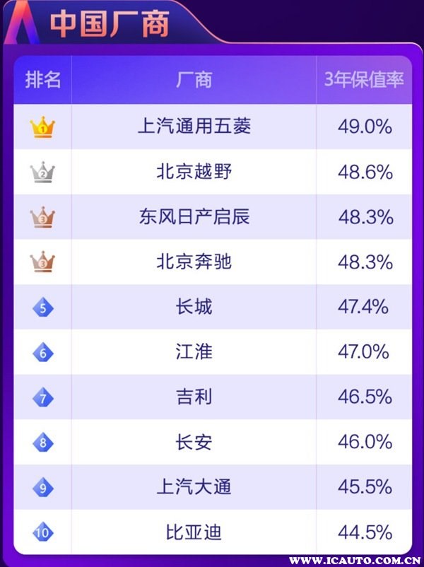 因為國產(chǎn)車在保值率方面的表現(xiàn)比較差,所以相關(guān)機構(gòu)為國產(chǎn)車/國產(chǎn)車企專門設(shè)置了榜單排名,其中上汽通用五菱以49%的3年保值率獲得第一名的寶座,比較讓人驚訝的是北京越野居然排到了第二名,而像長城、吉利、長安等一線自主品牌卻均無緣前三,這個結(jié)果還是比較出乎意料的,看來賣得好的車保值率也未必高。