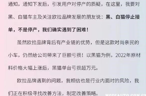 2022年2月23日,歐拉汽車CEO“董玉東”發(fā)布聲明稱:由于2022年新能源汽車原材料價(jià)格大幅上漲,導(dǎo)致歐拉黑貓單臺(tái)虧損超萬元,目前車型已經(jīng)給公司帶來了巨額虧損,所以黑貓、白貓均已停止接單,但車型并未停產(chǎn)。