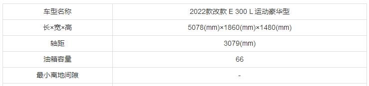 從上表可以了解到,奔馳E級 2022款 改款 E 300 L 運動豪華型這款車型的車身長度為5078mm、寬度為1860mm、高度為1480mm,軸距為3079mm。
