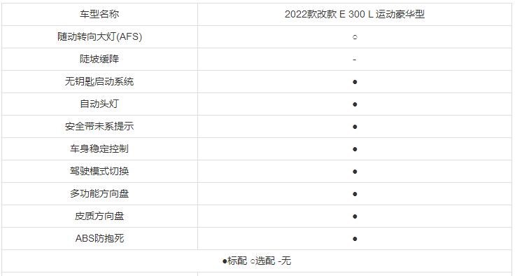 在配置方面,上表中顯示奔馳E級 2022款 改款 E 300 L 運動豪華型標配有無鑰匙啟動系統(tǒng),自動頭燈,安全帶未系提示,車身穩(wěn)定控制,駕駛模式切換,多功能方向盤,皮質(zhì)方向盤,ABS防抱死等。
