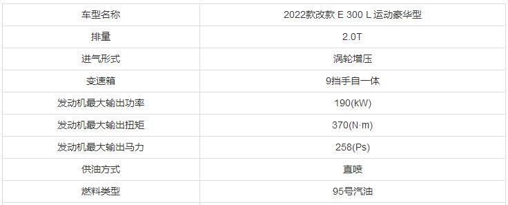 奔馳E級 2022款 改款 E 300 L 運動豪華型的動力如上表所示,該款車采用的是2.0T 9擋手自一體的動力組合,其中最大可輸出258Ps的馬力、370N·m的扭矩及190kW的功率。