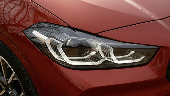 寶馬X2的前臉采用了X家族統(tǒng)一的不開眼角的設(shè)計,雙腎前格柵使用了類似梯形的造型,使得前臉看起來更加寬大,天使眼的造型是六邊形設(shè)計,增加了車輛辨識度。