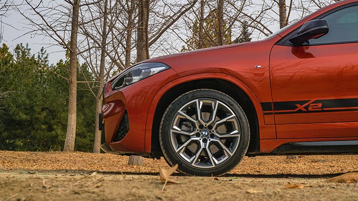 從側(cè)面看X2的線條,是更接近傳統(tǒng)的SUV,但是后輪布置的更靠后,更富運動感。側(cè)裙也使用了黑色拉花,并且使用了專屬的19寸輪轂。車身尺寸為4379/1824/1555mm,軸距為2670mm,它的車身比較低比較寬更加偏向運動。