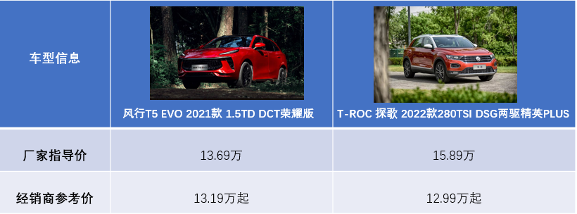 今天我們就選擇同一級(jí)別的SUV車型風(fēng)行T5 EVO 2021款1.5TD DCT榮耀版與T-ROC探歌2022款280TSI DSG兩驅(qū)精英PLUS(以下簡(jiǎn)稱風(fēng)行T5 EVO與探歌)做個(gè)對(duì)比,看看這兩款車在安全性能上誰(shuí)更出色?