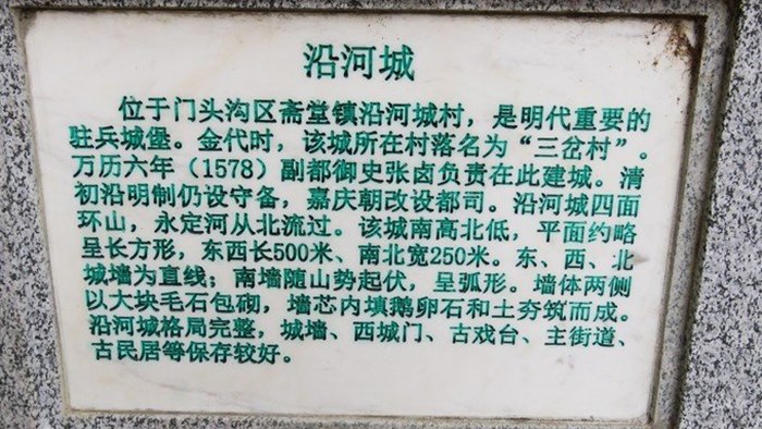 沿河城內(nèi)城長(zhǎng)約一華里,寬約半華里,分東西兩門(mén)。東門(mén)名“萬(wàn)安門(mén)”,可惜毀于20世紀(jì)50年代,只殘留城墻和門(mén)洞尚可辨認(rèn)。東門(mén)城墻上立有“沿河城”的石碑。 沿河城及敵臺(tái)在門(mén)頭溝區(qū)西北山上。為明代邊塞城堡,屯兵要塞。因城靠近永定河,故名沿河城。