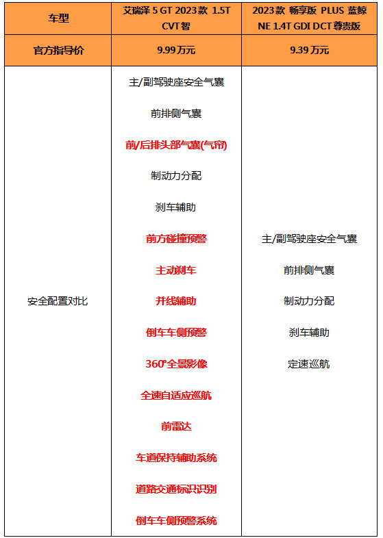 對于那些真正務(wù)實、理性的消費者而言,跟大多數(shù)“花里胡哨”的配置比起來,安全更是日常用車的重中之重。反應(yīng)到車型身上,就是汽車在主被動安全配置層面的差異。為了公平起見,這里選取2023款 暢享版 PLUS 藍鯨NE 1.4T GDI DCT尊貴版和同在9萬級價位艾瑞澤5 GT 2023款 1.5T CVT智(簡稱艾瑞澤5 GT智)進行對比。