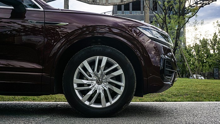 途銳的車身尺寸為4878*1984*1694mm,軸距2899mm。車身側(cè)面造型厚重飽滿,鋒利的腰線在貫穿車身,跟拱起的輪眉呼應(yīng),霸氣十足。這臺(tái)入門款的途銳使用了素色19英寸輪轂,搭配255/55 R19輪胎。翼子板上的R標(biāo)是全系標(biāo)配的裝飾件。