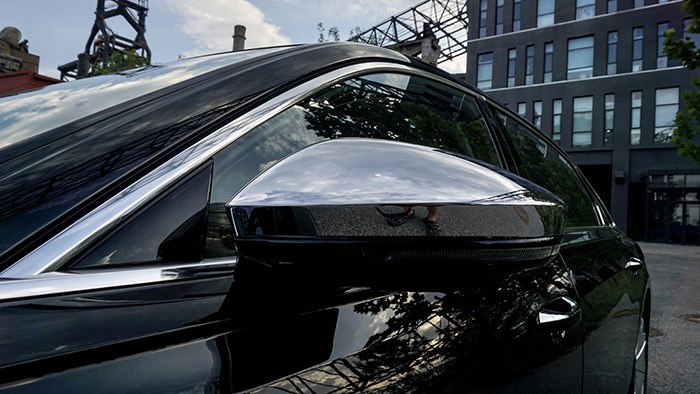 除了大型鍍鉻中網(wǎng),還有霧燈裝飾罩、反光鏡,以及后杠等處運(yùn)用了更多的鍍鉻裝飾,尤其是電鍍的反光鏡在奧迪車型中很少見。