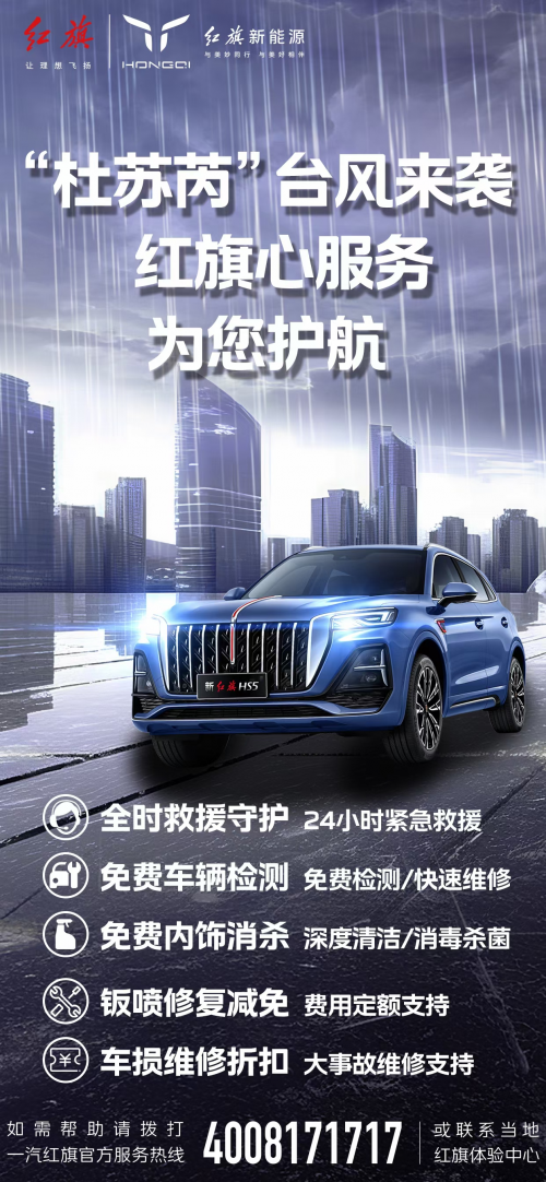 臺(tái)風(fēng)來(lái)臨前,及時(shí)發(fā)布預(yù)警信息,提醒臺(tái)風(fēng)天用車安全事項(xiàng),通過(guò)微信、短信等途徑覆蓋用戶8.5萬(wàn)人次,有效保障用戶出行安全。同時(shí),紅旗品牌快速出臺(tái)專項(xiàng)關(guān)懷政策,為受災(zāi)用戶車輛提供“全時(shí)救援守護(hù)、免費(fèi)車輛檢測(cè)、免費(fèi)內(nèi)飾消殺、鈑噴修復(fù)減免、車損維修折扣”5項(xiàng)權(quán)益,切實(shí)讓用戶感受到紅旗品牌的關(guān)懷與溫暖。截止8月3日,一汽紅旗已累計(jì)收到車輛救援需求257臺(tái),拖車回店220臺(tái),現(xiàn)場(chǎng)維修37臺(tái)。