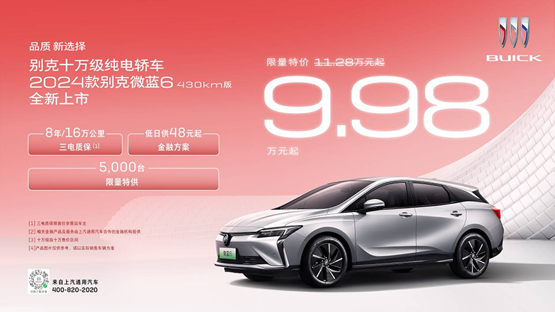 近日,別克新款微藍(lán)6 430km版上市,售價(jià)9.98萬(wàn)元起,限量5000臺(tái)。