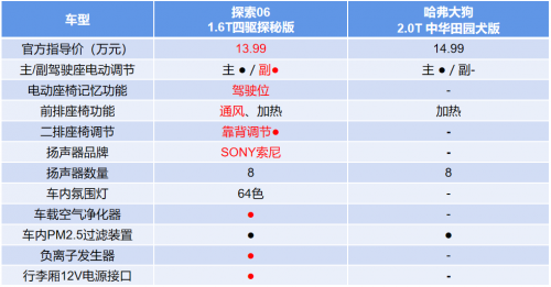 反觀哈弗大狗,內(nèi)飾質(zhì)感一般不說(shuō),還僅支持主駕駛座椅電動(dòng)調(diào)節(jié),在舒適度打造上略輸一籌。此外,哈弗大狗最高版本車(chē)型才配備了8揚(yáng)音響,氛圍燈、車(chē)載空氣凈化器、負(fù)離子發(fā)生器等舒適性配置都沒(méi)有,在座艙打造上的用心程度明顯不夠。