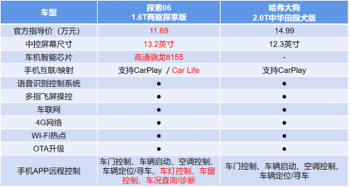 同時(shí),探索06內(nèi)置行業(yè)頂級(jí)8155極智算力AI芯片,可以實(shí)現(xiàn)2秒開(kāi)機(jī)、30秒內(nèi)識(shí)別20 條指令,運(yùn)行流暢絲滑不卡頓,操作起來(lái)極具爽感??紤]到現(xiàn)在年輕人都是手機(jī)重度用戶(hù),探索06特打造了豐富的手機(jī)APP遠(yuǎn)程功能,車(chē)門(mén)、車(chē)窗、空調(diào)控制等一應(yīng)俱全,還可以通過(guò)手機(jī)APP進(jìn)行車(chē)況查詢(xún)和診斷,一部手機(jī)即可解決大部分用車(chē)問(wèn)題。而哈弗大狗的手機(jī)APP遠(yuǎn)程控制功能遠(yuǎn)沒(méi)有探索06豐富,對(duì)年輕人的喜好把控嚴(yán)重不足。