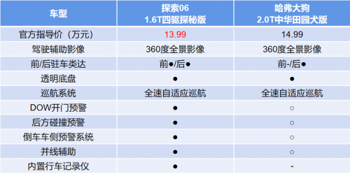 當(dāng)然,出去撒野更要保障行車(chē)安全。探索06基于中國(guó)、歐盟、東盟、澳洲、南美的全球五星安全的苛刻標(biāo)準(zhǔn)設(shè)計(jì),全車(chē)超80%高強(qiáng)度鋼,扭轉(zhuǎn)剛度23000Nm/deg,同級(jí)領(lǐng)先。配合籠式吸能太空艙車(chē)身設(shè)計(jì),為用戶(hù)把座駕打造成移動(dòng)的安全堡壘。此外,在主動(dòng)安全方面,探索06同樣表現(xiàn)出色。經(jīng)過(guò)對(duì)比可以看出,探索06在價(jià)格比哈弗大狗便宜10000元的情況下,在配置上多了DOW開(kāi)門(mén)預(yù)警、后方碰撞預(yù)警、倒車(chē)車(chē)側(cè)預(yù)警系統(tǒng)、并線輔助等功能,無(wú)論是安全性能還是性?xún)r(jià)比都遙遙領(lǐng)先。