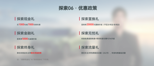 作為年輕人的專屬座駕,探索06提供都市版和悅野版兩款車型供用戶選擇,從顏值、座艙配置、動力配置等各方面給他們?nèi)鎸櫮?。同時,探索06還給大家?guī)砹顺鄬嵒?,現(xiàn)在入手即可享受交1000元抵7000元購車款,還有至高5000元金融補貼、至高20000元置換補貼(不區(qū)分本品/非本品)等多重福利,10萬出頭就可以能把它開回家。