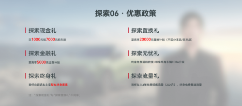 更值得一提的是,探索06還為用戶準(zhǔn)備了豐厚的福利?,F(xiàn)在入手即可享受交1000元抵7000元購(gòu)車款、至高20000元置換補(bǔ)貼、至高5000元金融補(bǔ)貼等六重驚喜好禮。如今臨近春節(jié),感興趣的朋友可以去4S店試駕,用探索06開啟你的新一年旅途!