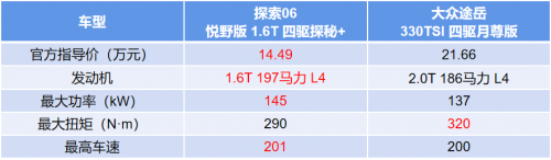 大眾途岳的四驅(qū)版型搭載2.0T發(fā)動(dòng)機(jī),最大功率137kw、最大扭矩320N·m。雖然扭矩相對(duì)要大一些,但功率比探索06低,價(jià)格還高出很多。綜合對(duì)比下來,大眾途岳的動(dòng)力表現(xiàn)并不突出,面對(duì)探索06沒有競(jìng)爭(zhēng)力。
