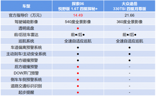 同樣以兩者的四驅(qū)車型作對(duì)比,我們可以發(fā)現(xiàn),探索06在價(jià)格實(shí)惠接近10萬(wàn)元的情況下,智能科技配置甚至比大眾途岳還要領(lǐng)先和豐富。比如,兩者都搭載了全速自適應(yīng)巡航和倒車影像等功能,但探索06為540度高清全景影像,比大眾途岳多了透明底盤的功能,在坑洼路段行駛時(shí)能看到車底視角,在戶外駕駛時(shí)更加安全。同時(shí),探索06除了自動(dòng)駐車、車道偏離預(yù)警系統(tǒng)、前方碰撞預(yù)警等主動(dòng)安全配置外,比大眾途岳多了開門預(yù)警、后方碰撞預(yù)警、起步提醒等多項(xiàng)科技,安全實(shí)力更勝一籌。