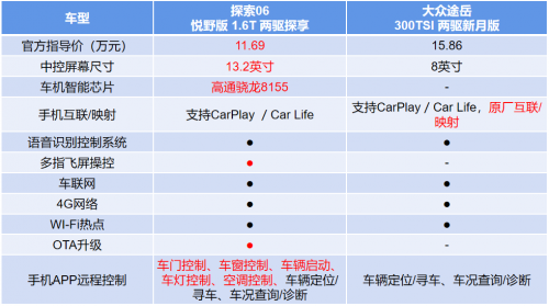 當(dāng)然,探索06的科技配置不止在安全方面更全面和領(lǐng)先,在智慧出行生活的打造上同樣比大眾途岳高一個(gè)層次。拿年輕人都看重的車機(jī)互聯(lián)來說,探索06全系搭載13.2吋超級(jí)交互AI數(shù)字屏,最新上的四驅(qū)探秘 版型更是把中控屏幕尺寸做到了14.8吋,看起來科技感十足。而大眾途岳入門版本中控屏幕僅有8吋,高配版型才搭載12吋的屏幕,大小還不如探索06的入門尺寸,在科技感營(yíng)造上就落后一大截。同時(shí),探索06全系標(biāo)配行業(yè)頂級(jí)的智能8155芯片,能輕松實(shí)現(xiàn):車機(jī)實(shí)現(xiàn)2秒開機(jī)、 30秒內(nèi)識(shí)別20 條指令。105K的CPU算力十分給力,給用戶以更絲滑流暢的操作體驗(yàn)。支持OTA遠(yuǎn)程升級(jí),無需進(jìn)店就能實(shí)現(xiàn)智能成長(zhǎng),十分方便快捷。反觀大眾途岳,中低配版本不支持OTA升級(jí),在互聯(lián)網(wǎng)時(shí)代略顯落后。