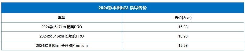 近日,一汽豐田2024款bZ3正式上市,共推出3款車型,售價區(qū)間為16.98-19.98萬。