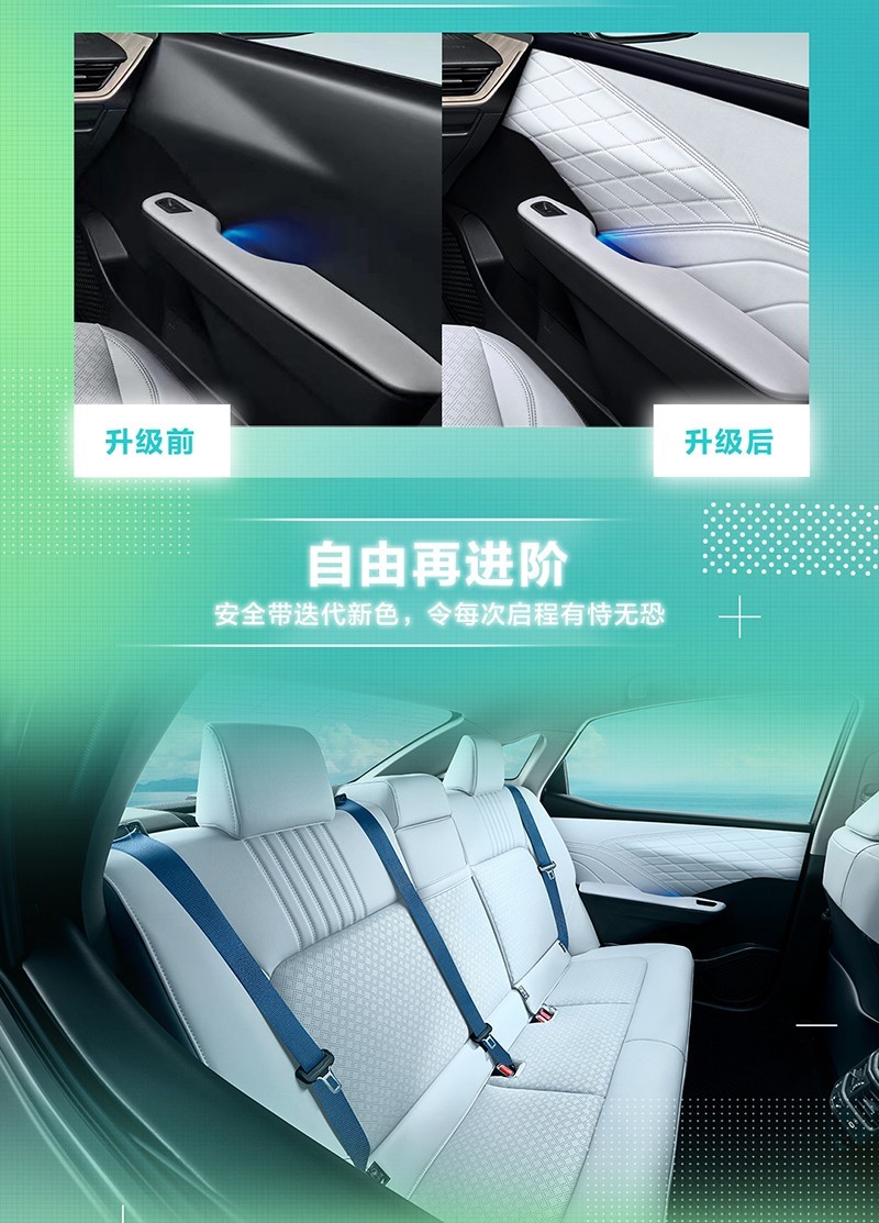 內飾方面,新車采用全新液晶儀表以及大尺寸中控屏,并升級內飾材質。座椅增加菱形縫線及增加藍色安全帶。