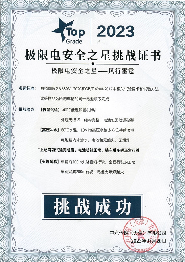 正如上面所描述的,理論上四維超高防護(hù)盾技術(shù)能對(duì)風(fēng)行雷霆的電池安全進(jìn)行極其完善地保護(hù),而實(shí)際上也是能做到的。為了讓消費(fèi)者能夠更加直觀地感受到其出色的電池安全性能,在中汽研TOP Safety測(cè)試中,車輛即使面對(duì)側(cè)柱碰撞、刮底、托底測(cè)試,電池也沒有太大的變形;而24小時(shí)水下浸泡電池的安全測(cè)試中,同樣順利通過,可見鎧甲電池具有極高的安全性。而在中汽研Top Grand“極限電安全之星”證書認(rèn)證中,車輛成功通過低溫、高壓沖水及整車火燒的測(cè)試項(xiàng)目。