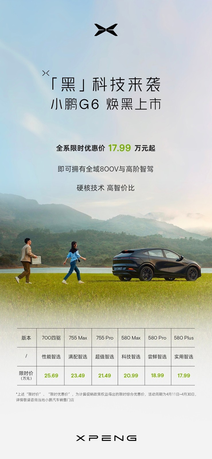 4月11日,小鵬G6新增入門(mén)版車(chē)型上市,并開(kāi)啟限時(shí)優(yōu)惠價(jià),售價(jià)17.99萬(wàn)。