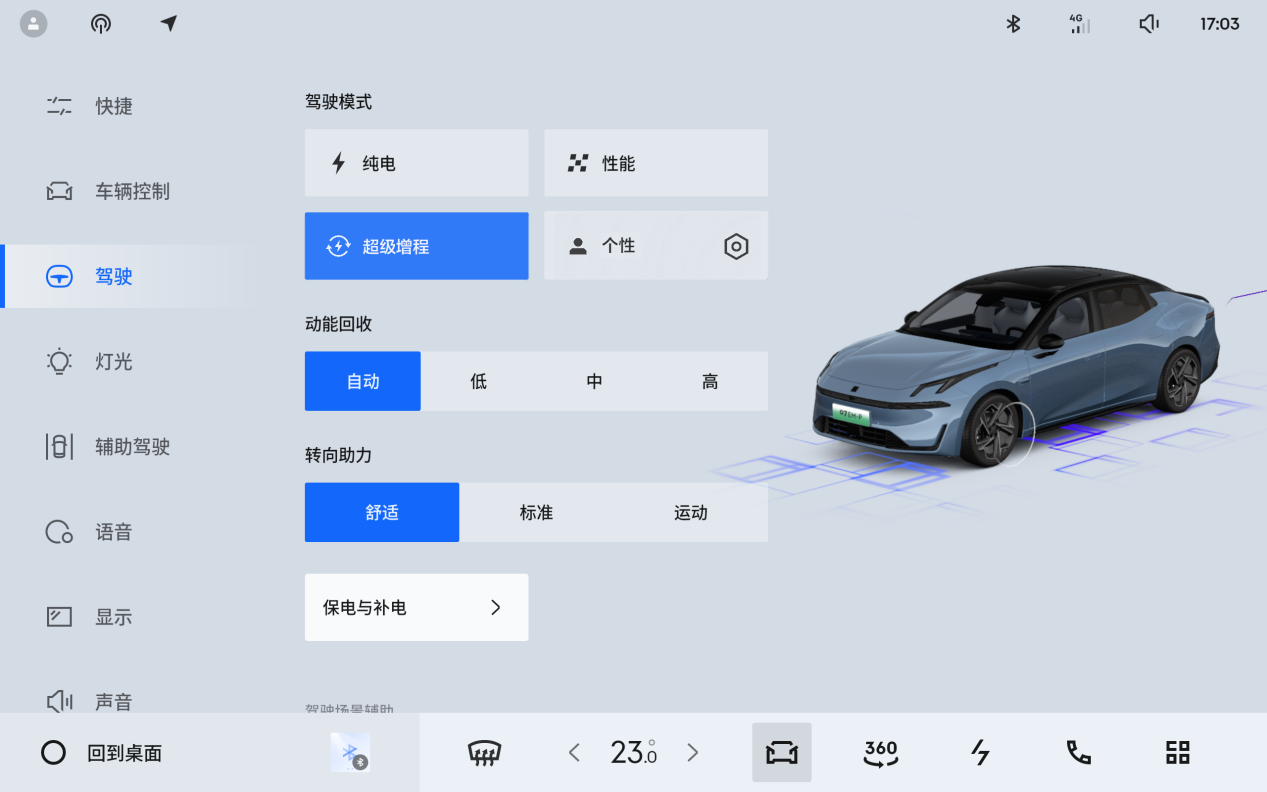 作為高端混動(dòng)車(chē)型,領(lǐng)克07 EM-P超級(jí)增程電動(dòng)方案具備7類(lèi)驅(qū)動(dòng)模式,提供純電模式、性能模式、超級(jí)增程模式、個(gè)性模式共4種駕駛模式。其中,以智能化技術(shù)為核心,打造的超級(jí)增程模式,可在不同使用場(chǎng)景,自動(dòng)根據(jù)行駛狀態(tài)智能切換,最大化利用各能源形式的“高效區(qū)間”。如在城市道路(時(shí)速88km/h以內(nèi)),會(huì)優(yōu)先電感駕駛,選擇電機(jī)直驅(qū),高速道路(時(shí)速88km/h以上)則優(yōu)先并聯(lián)/直驅(qū),電混引擎高效介入,其帶寬全覆蓋經(jīng)濟(jì)性與高性能,隨時(shí)保持最佳輸出。同時(shí),基于智能能量管理,領(lǐng)克07 EM-P可對(duì)全旅程能耗進(jìn)行預(yù)測(cè)和能量規(guī)劃,在油電之間智能切換,暢通道路用油、低速擁堵道路用電的出行體驗(yàn),從而達(dá)到節(jié)油和舒適的目的。虧電狀態(tài)下,百公里省油約10%-15%。