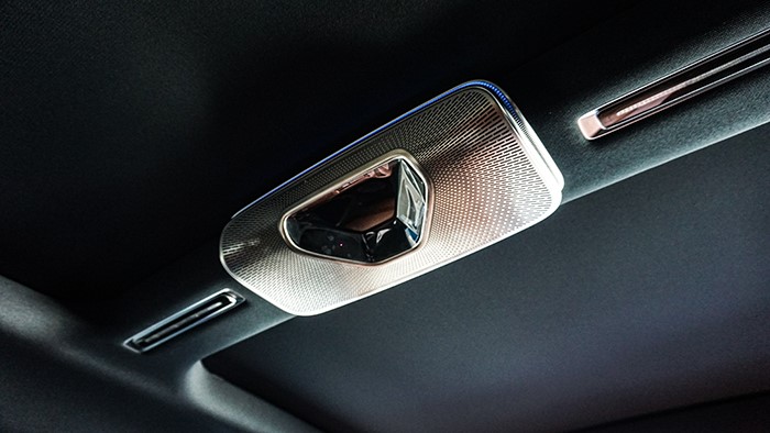 “湖光樓影”的水平延展雙段式尾燈通過內部的立體鉆石切割,將石柱有序排列,仿佛鱗次櫛比般,伴隨著剎車燈的點亮,呈現出粼粼如湖光掠影的震撼效果。