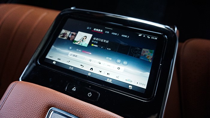 座艙空間寬敞舒適,提供了極致的乘坐體驗。后車窗還有電動遮陽簾以及車內香氛,后排還提供兩個獨立的顯示屏,并在B柱上有空調出風口,車內的豪華感不言而喻。