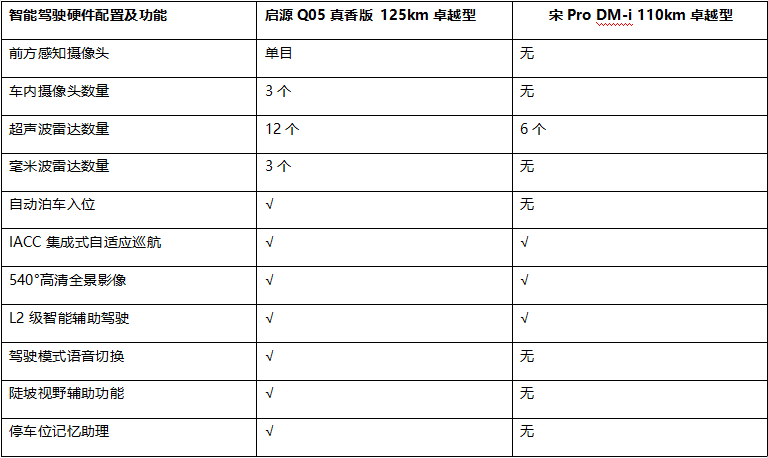 不過,啟源Q05真香版的智能化硬件配置比宋Pro DM-i更豐富。Q05配置3個(gè)毫米波雷達(dá),12個(gè)超聲波雷達(dá),3個(gè)車內(nèi)攝像頭以及前方感知攝像頭,使得Q05的智能駕駛能力遠(yuǎn)超宋Pro DM-i。