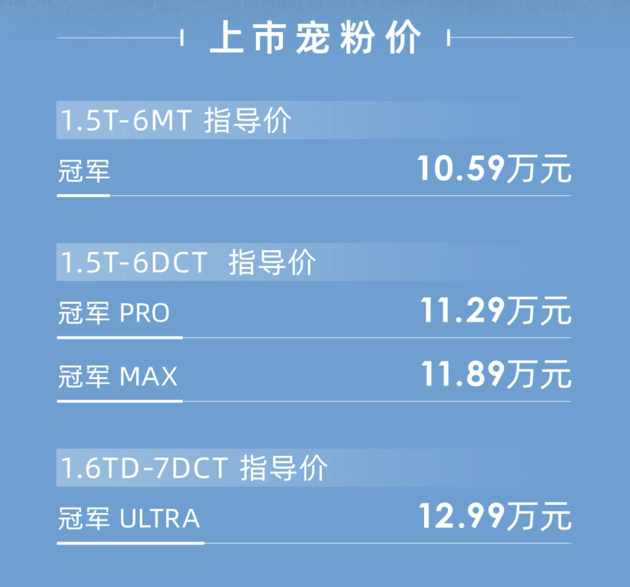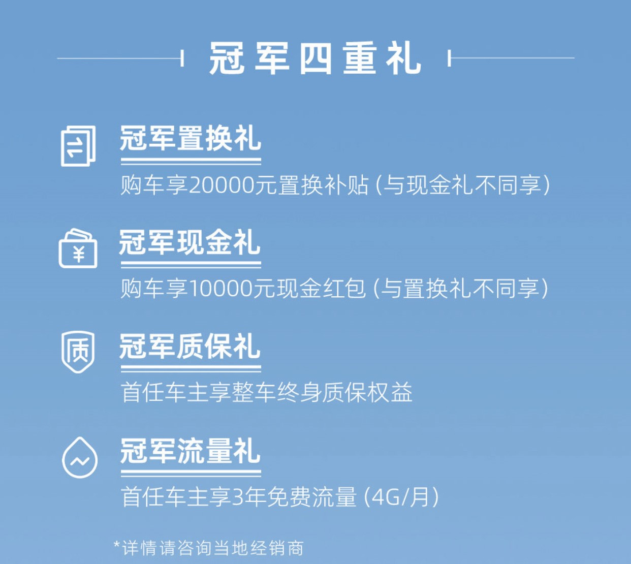 購車用戶可享冠軍置換禮、冠軍現(xiàn)金禮、冠軍質(zhì)保禮、冠軍流量禮等四重權(quán)益,包括20000元置換補貼(與冠軍現(xiàn)金禮不同享)、購車享10000元現(xiàn)金紅包(與冠軍置換禮不同享);首任車主享整車終身質(zhì)保以及3年免費流量(4G/月)。