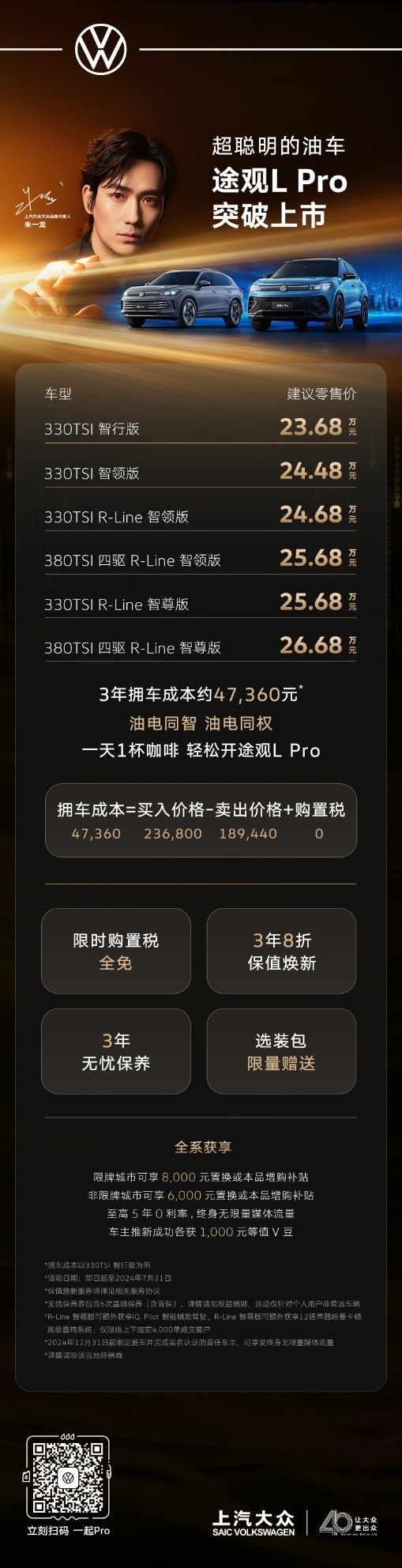 5月30日,途觀L Pro正式上市,打出“擁車成本”概念。三年擁車成本僅需47,360元起?,F(xiàn)在購車將限時獲得購置稅全免、3年8折保值煥新、3年無憂保養(yǎng)以及選裝包限量贈送等權(quán)益(詳情請洽當?shù)亟?jīng)銷商)。