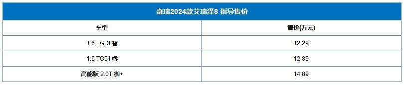 近日,奇瑞2024款艾瑞澤8上市,共推出3款車型,售價區(qū)間為12.29-14.89萬。