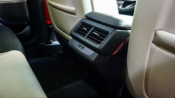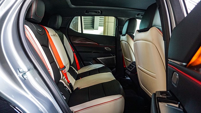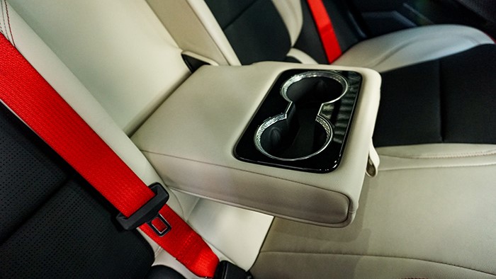 空間布局:凱迪拉克GT4的后排空間可以勝任日常家用,后排座椅寬大舒適,同樣使用紅色安全帶,十分搶眼。后排設置有空調(diào)出風口及手機電源接口。