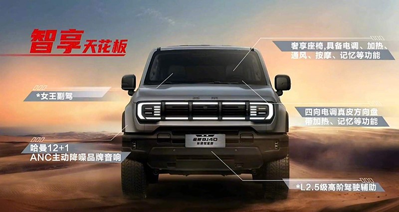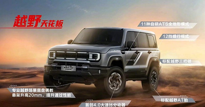 動(dòng)力方面,新車搭載2.0T發(fā)動(dòng)機(jī),最大功率180W,峰值扭矩395N·m。傳動(dòng)匹配8AT變速箱。新車將配備4.0大速比分動(dòng)器、三把鎖、11種自研ATS全地形模式及12擋蠕行模式。