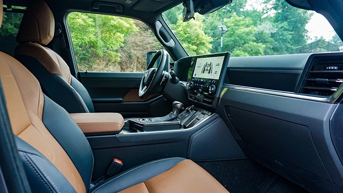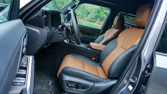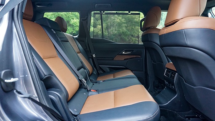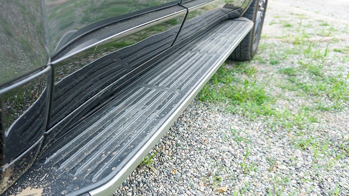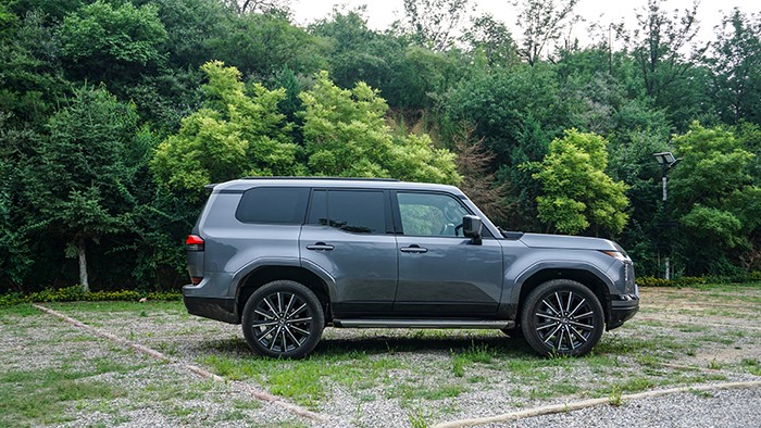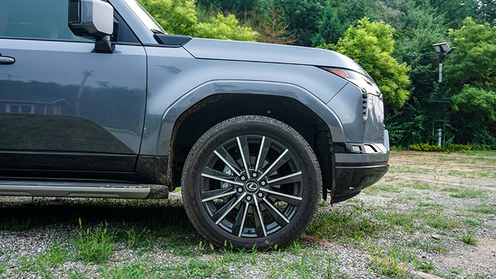 GX550h凌峰版使用了22寸輪轂,輪胎規(guī)格為265/50 R22,品牌為鄧祿普,作為一臺硬派越野車實(shí)屬不小。大尺寸的車輪增加了整體的視覺沖擊力,同時(shí)也提升了車輛的運(yùn)動(dòng)感和豪華感。為了上車方便,腳踏板也是原廠配置。