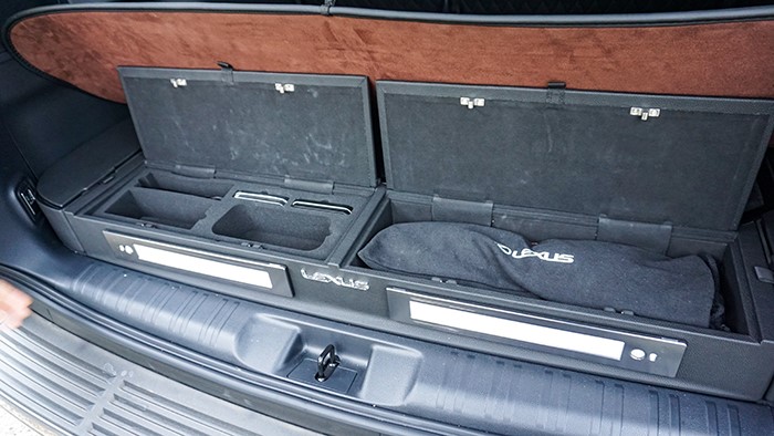 后背箱內(nèi)部帶有一個(gè)小臺面,內(nèi)部為品牌精品,像手電、拖車?yán)K、雨傘、保溫杯、甚至撲克牌都有配備。