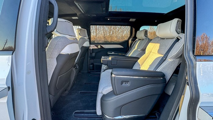 說到尊貴的第二排商務(wù)艙空間,兩個舒適的航空座椅帶有通風(fēng)按摩加熱及一鍵式0重力功能,還有頭頂?shù)亩嗝襟w液晶顯示屏,讓旅途不再枯燥。側(cè)滑門的玻璃是可以電動升降的,還鑲嵌了數(shù)字時鐘,豪華感的營造十分到位。