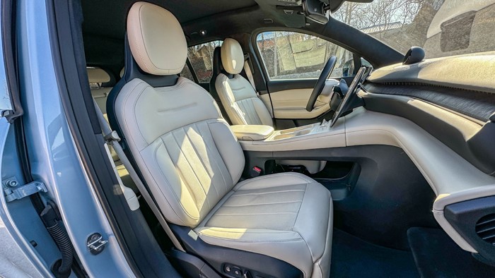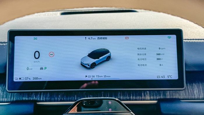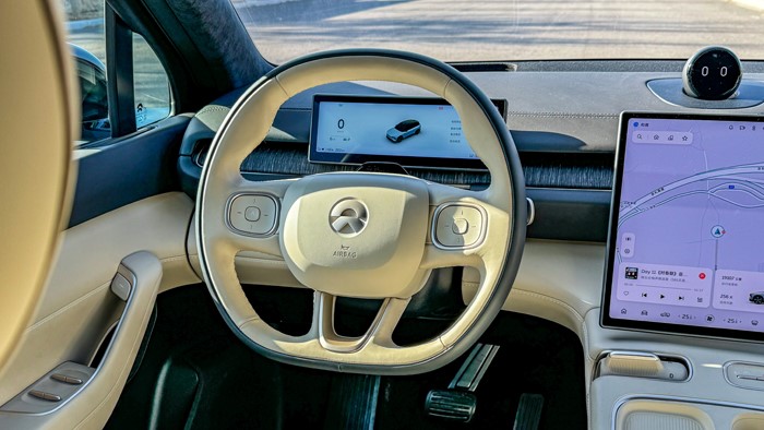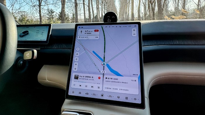中控臺兩個屏幕的清晰度到位,其全液晶儀表走的是簡約風(fēng)格,沒有花哨的配色和動態(tài)圖案,但像是顯示電量、速度,甚至是全屏地圖等功能都有提供。方向盤的線條設(shè)計的十分柔美,握感很舒適。