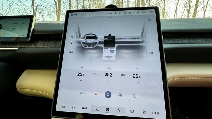 中控屏幕運行的是基于安卓開發(fā)的車載系統(tǒng),UI設(shè)計挺酷,導(dǎo)航、在線音樂等基礎(chǔ)功能都有配備,操作流暢度也接近安卓手機。幾乎所有的車輛操作都可在這個液晶屏上完成,車輛還帶有外放電功能,露營會很方便。