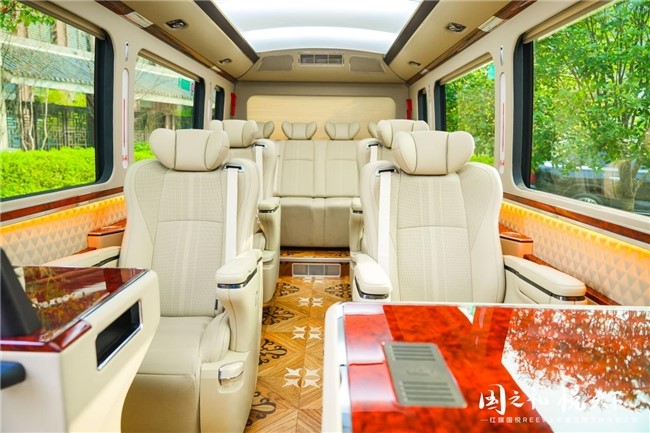 內(nèi)飾方面?zhèn)鞒辛思t旗國悅家族特點,采用超大空間設計,整車內(nèi)長5443mm、內(nèi)寬1900mm、內(nèi)高1900mm,同級領(lǐng)先。17座車型,座椅間距可達865mm,充分保證了每一個乘客的舒適性。為更好滿足不同場景的使用需求,紅旗國悅REEV提供17、19座多種布局可選。此外,行業(yè)首創(chuàng)副駕駛車門設計,極大提升了接待場景隨行人員上下車的便捷性,為服務人員提供了更好的悅享體驗。