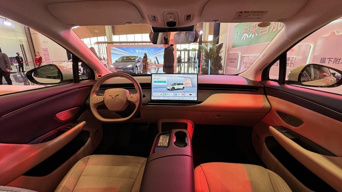 天工06的中控臺表面采用麂皮包裹,中控臺上有一塊懸浮式的中控屏,取消了傳統(tǒng)的實體儀表盤,取而代之的是巨大尺寸的HUD抬頭顯示。整體內(nèi)飾做工細膩,并且沒有新車的異味,可以看出環(huán)保用料非常到位。