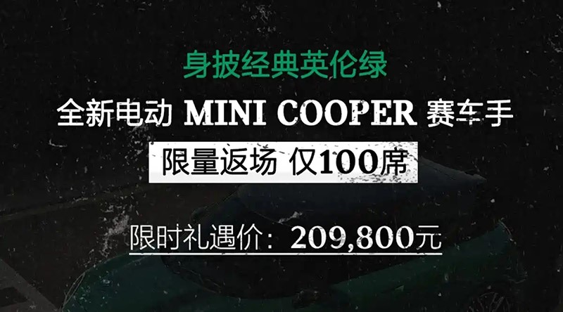 近日,全新電動MINI COOPER 賽車手上市,限時禮遇價20.98萬,限量100臺。