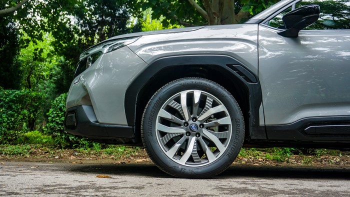 2026款 2.5i AWD 旗艦版EyeSight使用了19英寸鋁合金輪轂(旗艦版特有的規(guī)格)、黑色的車頂行李架、黑色的外后視鏡 、黑色的越野包圍套件、黑色的玻璃邊框、視覺上很有質(zhì)感。輪胎規(guī)格為235/50 R19。