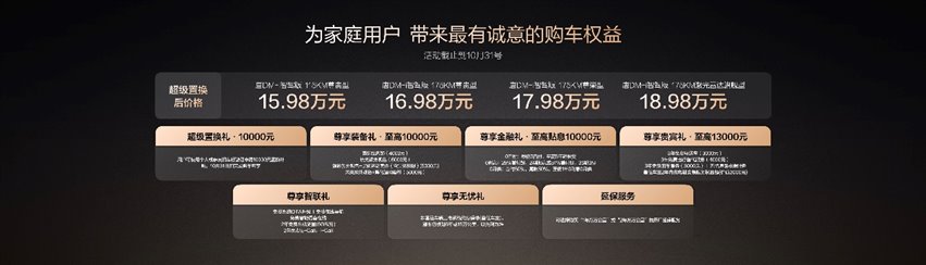 此次,唐DM-i智駕版175KM長續(xù)航版共推出3款車型,售價17.98萬~19.98萬元(10月31日前完成購車可享10000元置換補(bǔ)貼)。同時,比亞迪還為用戶準(zhǔn)備了包含置換補(bǔ)貼在內(nèi)的至高價值4.3萬元盛唐禮遇。