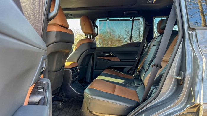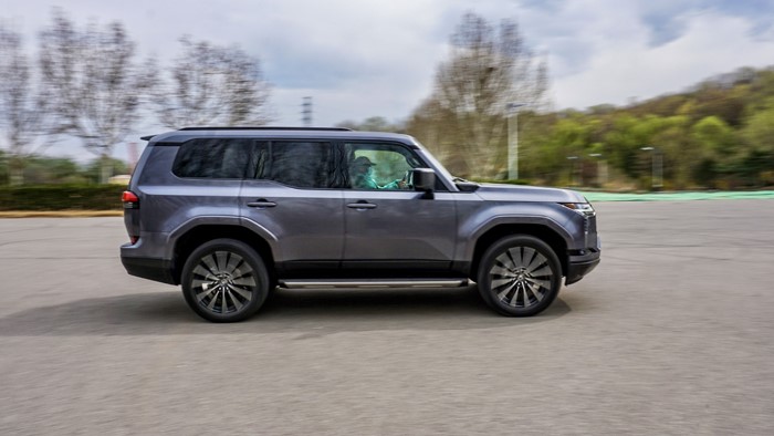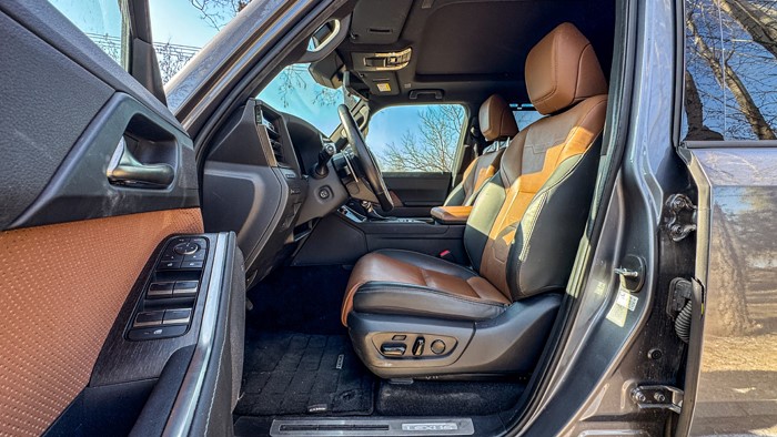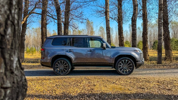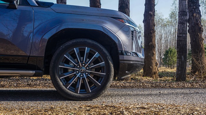 GX550h凌峰版使用了22寸輪轂,輪胎規(guī)格為265/50 R22,品牌為鄧祿普,作為一臺硬派越野車實屬不小。大尺寸的車輪增加了整體的視覺沖擊力,同時也提升了車輛的運動感和豪華感。為了上車方便,腳踏板也是原廠配置。