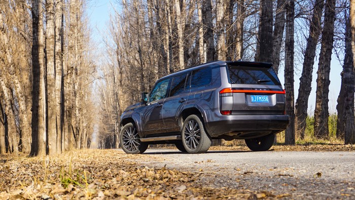 車身側(cè)面輪廓線條簡潔利落,展現(xiàn)出SUV的穩(wěn)重感和力量感。車窗下沿做了階梯式設(shè)計,方便駕駛員越野時觀察路況。車身尺寸為4960×1980×1935mm,軸距達(dá)到了2850mm。