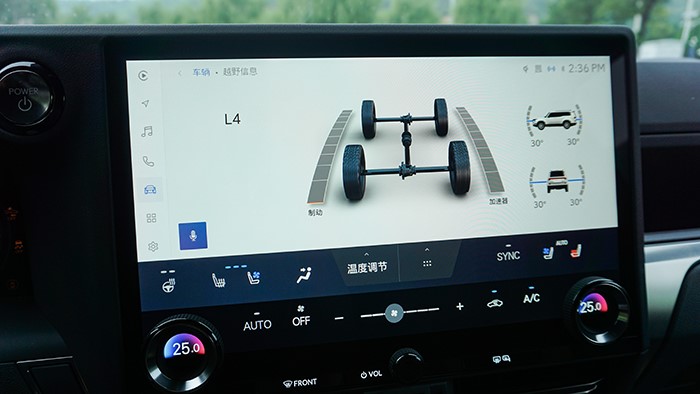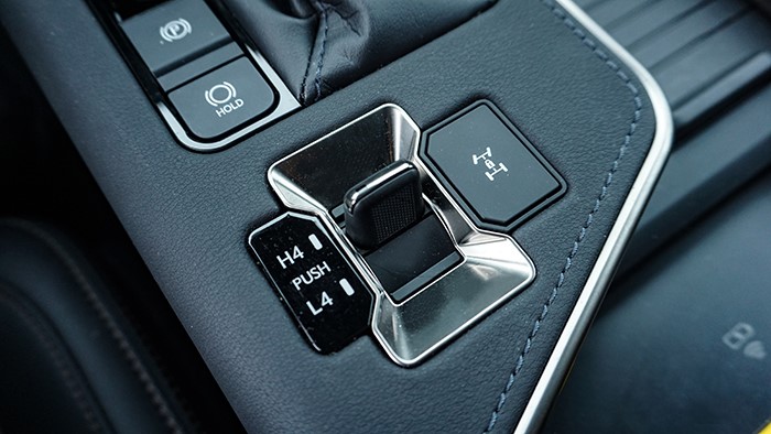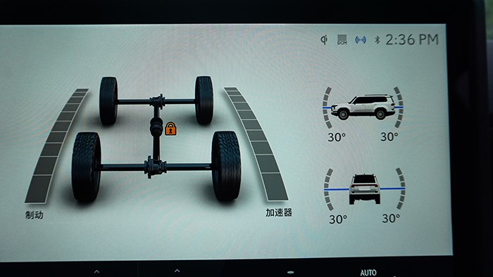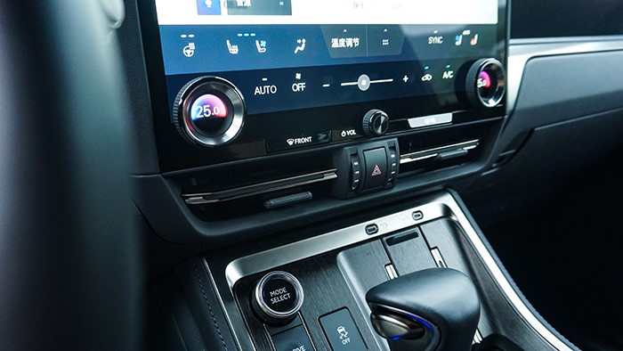 排擋桿附近設(shè)計有駕駛模式切換按鈕、高低四驅(qū)及中央差速鎖鎖止開關(guān),這也是這大玩具的靈魂所在,通過一些爛路都沒問題。
