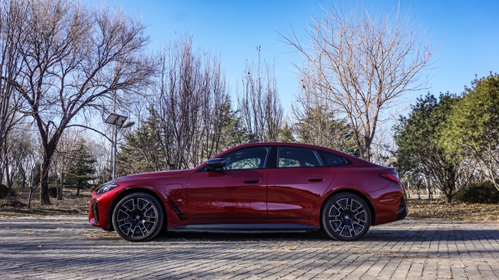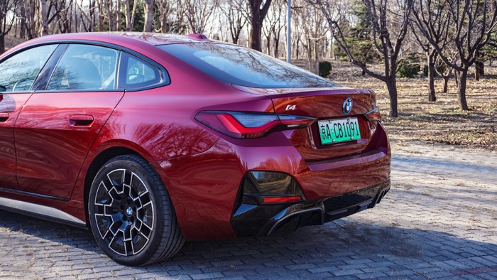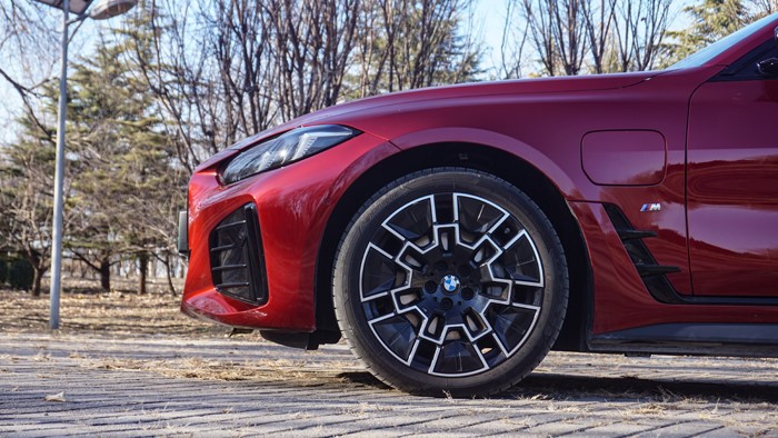 車輛側(cè)面左前翼子板處增加了充電接口,同時,寶馬i4標配的是18英寸半封閉式輪轂,本車選配了19寸,前輪胎規(guī)格245/45 R19,后輪胎規(guī)格255/45 R19。