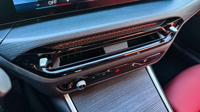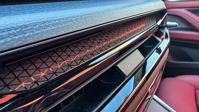 進入車內(nèi),氛圍燈迷幻色彩濃郁,按下啟動按鈕,隨之而來的是一段模擬的類似電流接入的聲音,非常像科幻片里那種飛船已就位,待命出發(fā)的既視感。